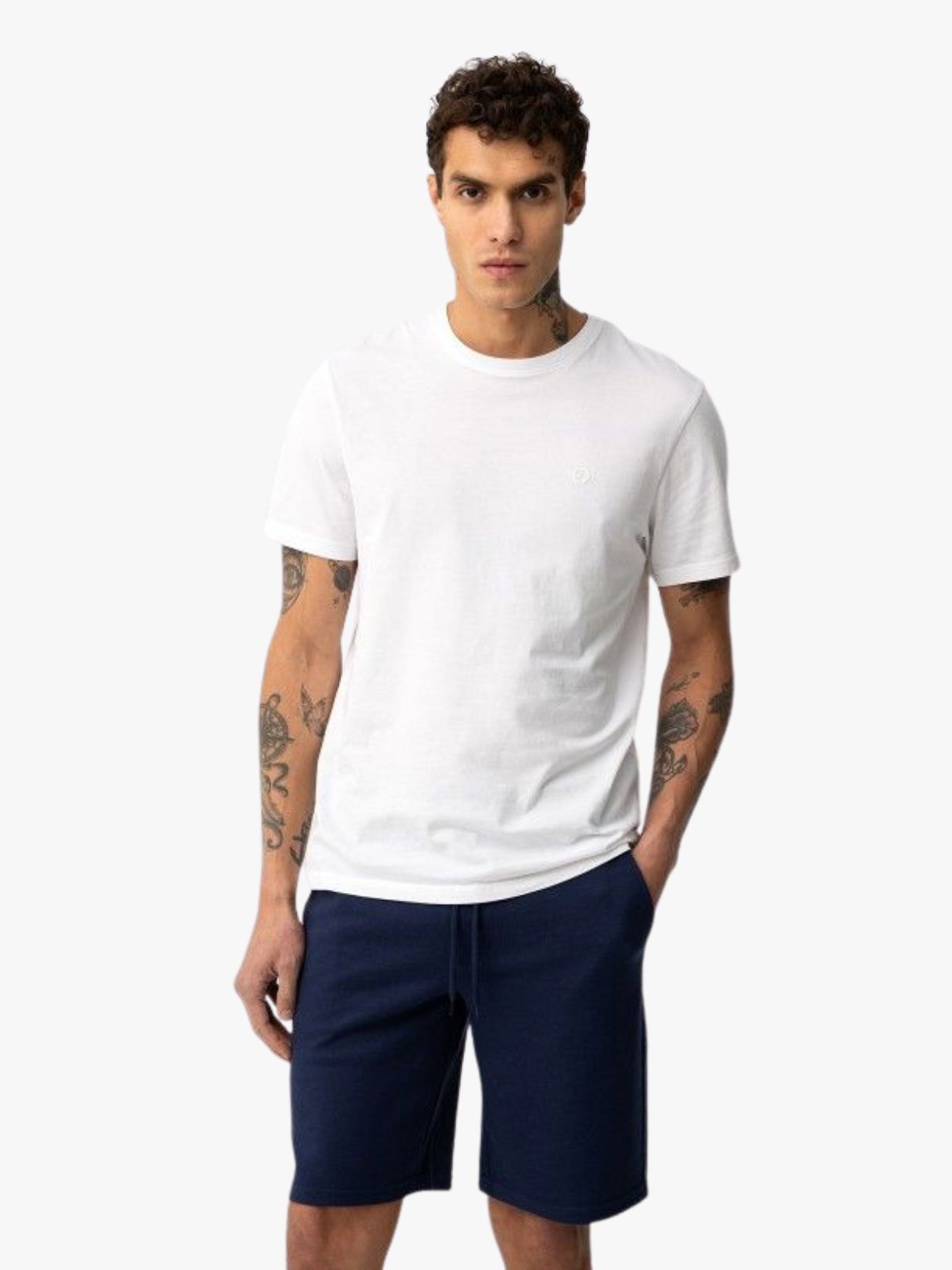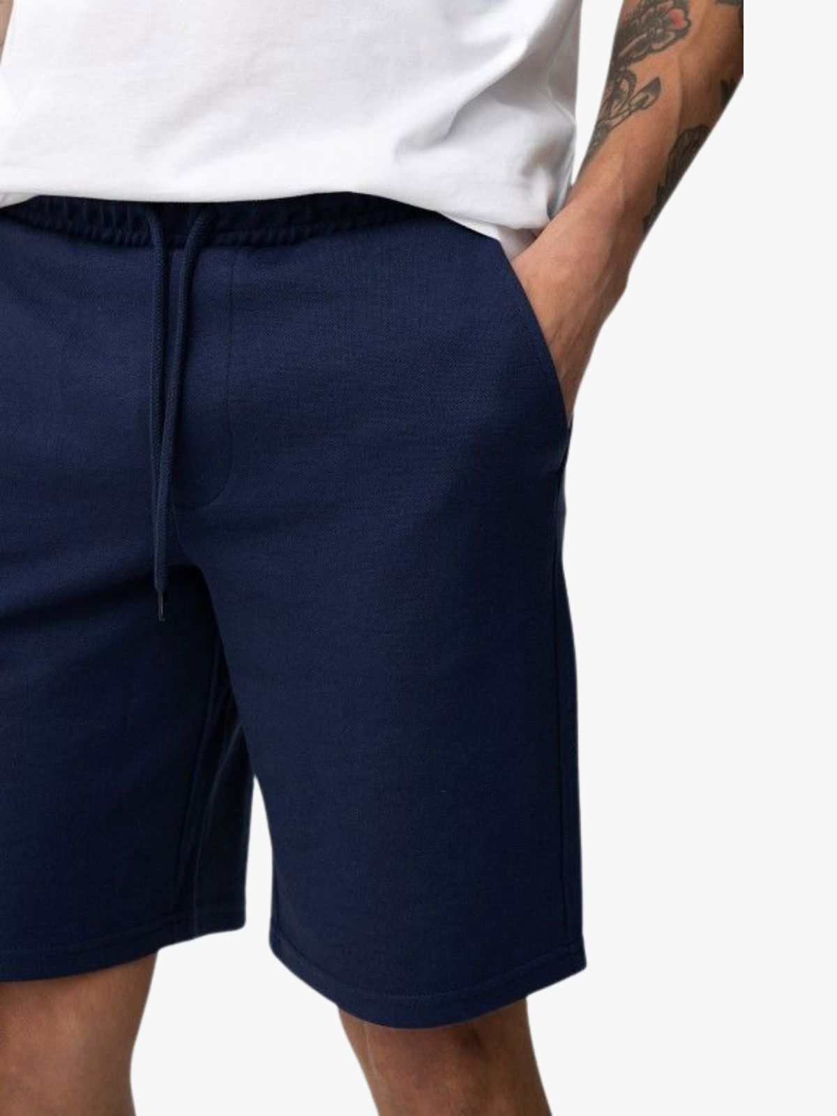 Precio habitual €29,90Shorts de color marino, corte recto, cintura elástica con cordón y bolsillos laterales visibles.